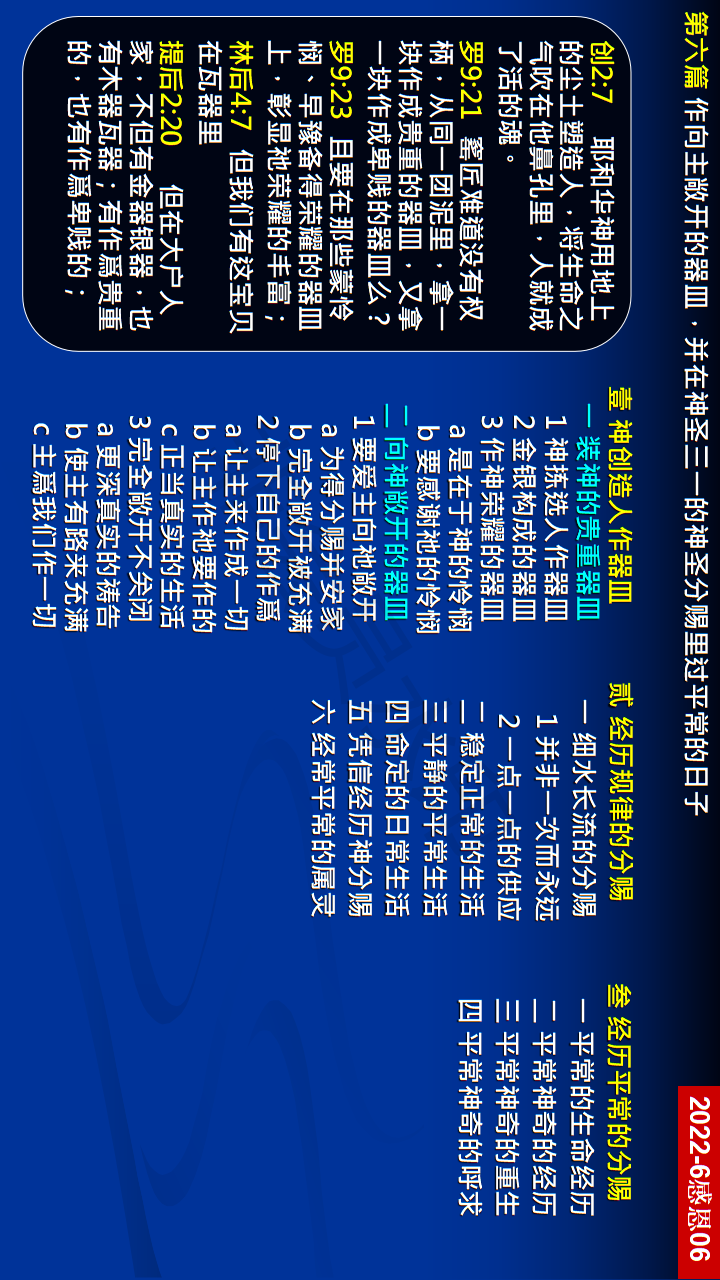 本篇信息作为这次特会的顶石,乃是基于前 面的五篇信息。关于神圣的分赐,我们必须 有三方面的认识。首先,神圣的分赐乃是三 一神永远的福分。因此,神圣的分赐也是一 件永远的事。其次,神圣的分赐在我们的经历中,有两方面。一面是外在、客观的,另 一面是内里、主观的,正如同将食物接受进 来后,胃就开始消化、吸收,以至于应用到 我们的细胞与纤维里。末了,神的目标乃是 要带我们经过生命的变化而达到成熟。为这 缘故,我们就需要作一向主敞开的器皿。