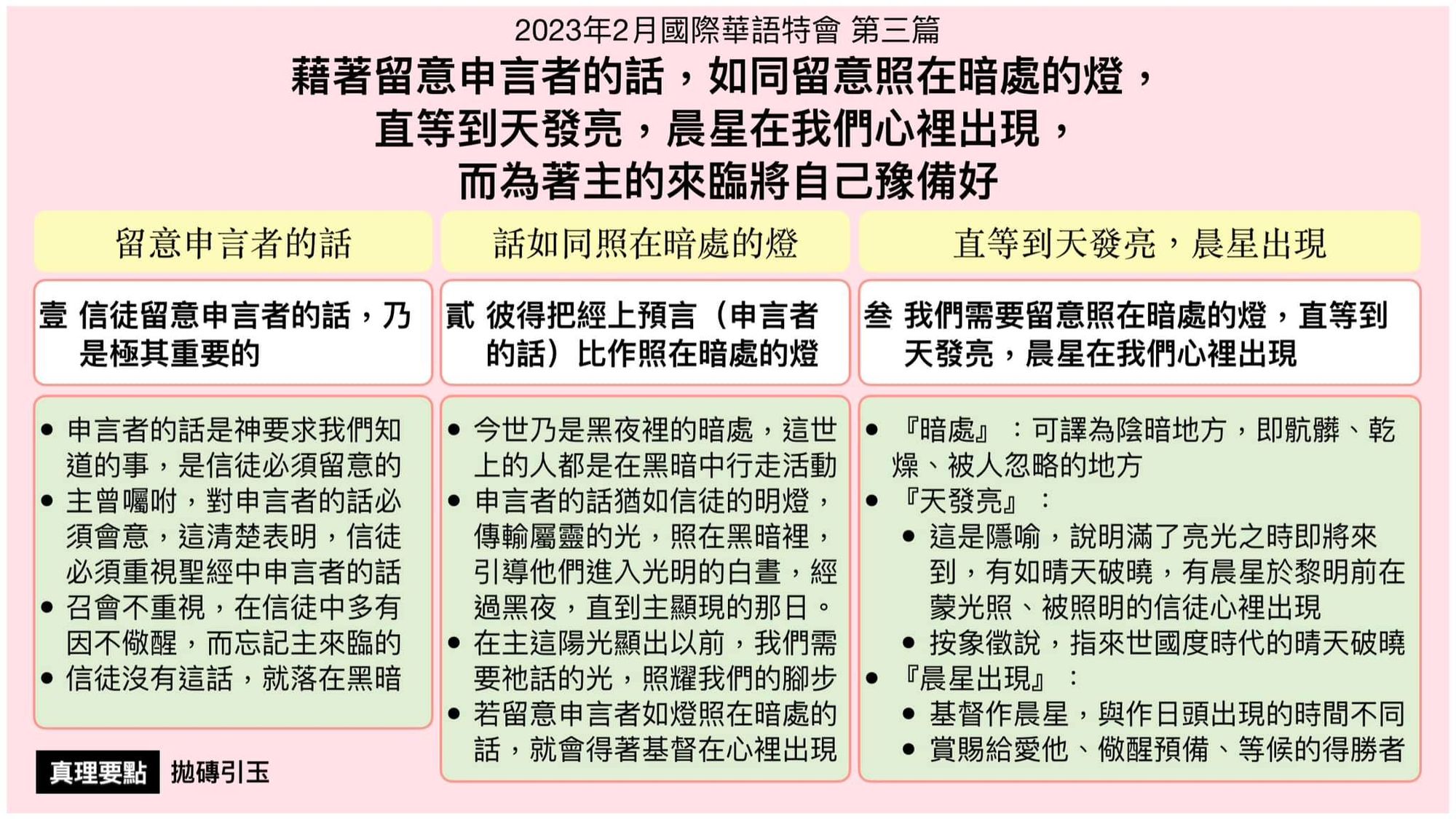 第三篇 借着留意申言者的话,如同留意照在暗处的灯,直等到天发亮,晨星在我们心里出现,而为着主的来临将自己预备好